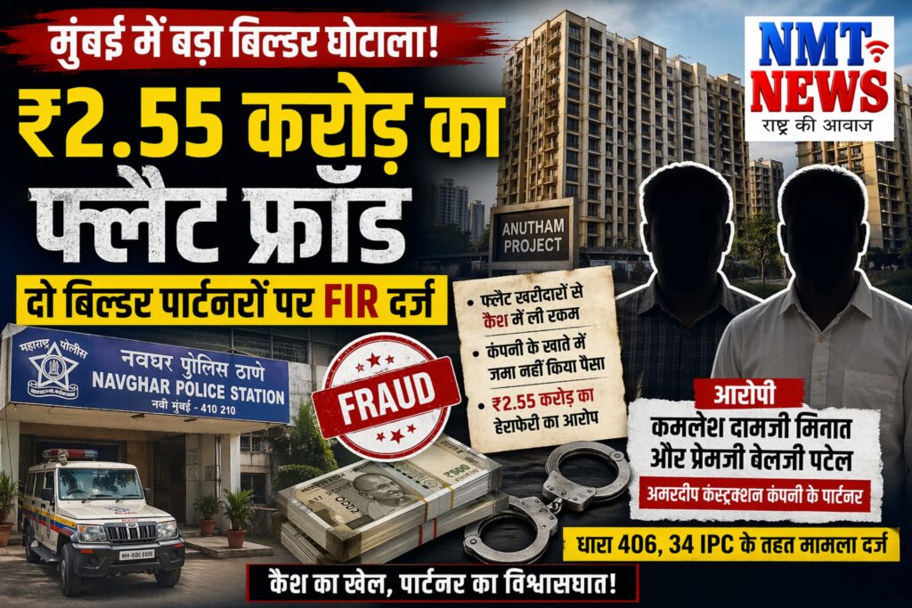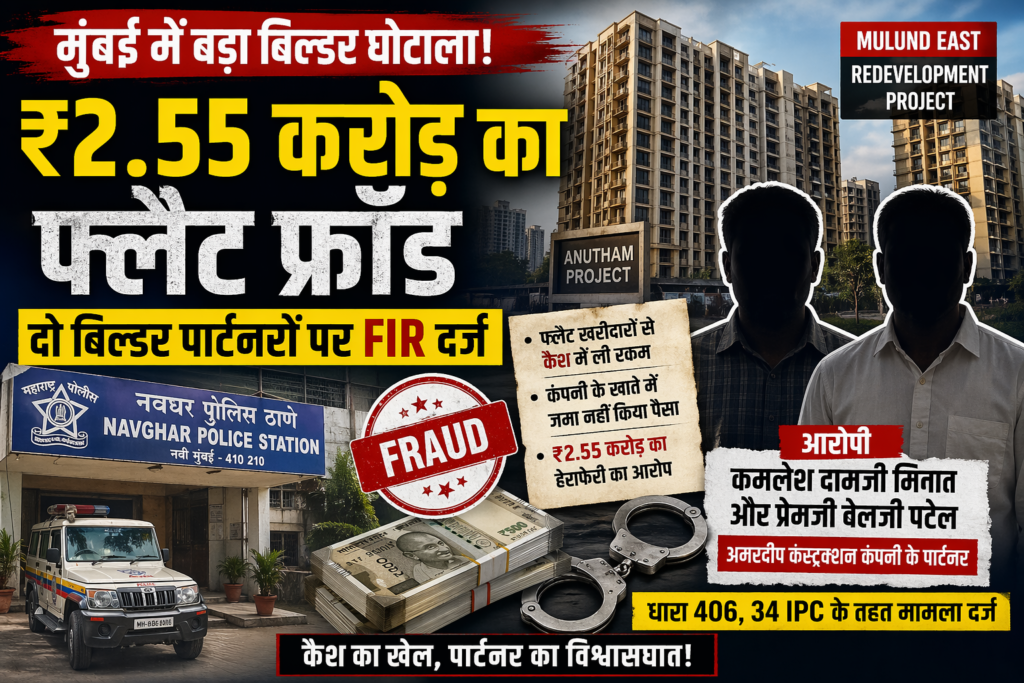 परमेश्वर सिंह / मुंबई : मुंबई के तेजी से बढ़ते रियल एस्टेट सेक्टर से एक चौंकाने वाला घोटाला सामने आया है, जहां भरोसे और साझेदारी की आड़ में करोड़ों रुपये का खेल खेला गया। मुलुंड पूर्व के चर्चित रीडेवलपमेंट प्रोजेक्ट में ₹2.55 करोड़ की कथित हेराफेरी के आरोप में नवघर पुलिस ने अमरदीप कंस्ट्रक्शन कंपनी के दो पार्टनरों के खिलाफ गंभीर धाराओं में मामला दर्ज किया है। इस सनसनीखेज मामले में आरोपी हैं- कमलेश दामजी मिनात और प्रेमजी वेलजी पटेल- जिन पर आरोप है कि उन्होंने फ्लैट बिक्री से प्राप्त रकम को कंपनी से छुपाकर खुद हड़प लिया। ‘दोस्ती से दुश्मनी’: पार्टनरशिप में दरार से खुला घोटाला पूरे मामले की शुरुआत एक अंदरूनी शिकायत से हुई। कंपनी के ही पार्टनर जेराम जेठा गामी (62), निवासी वाशी, ने पुलिस में शिकायत दर्ज कराई।
